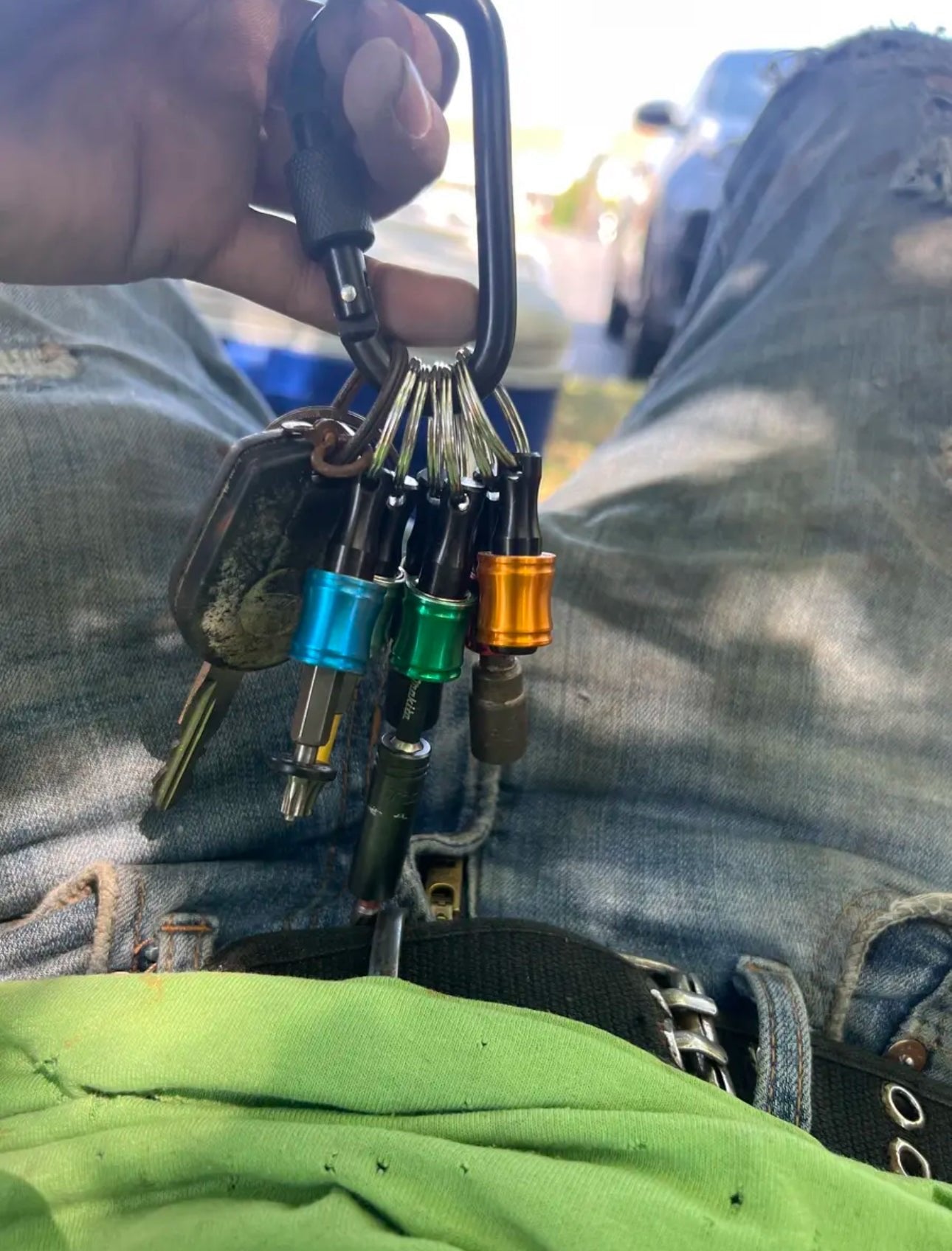 Erledige das Suchen nach dem passenden Bohrer für immer! Dieser Karabiner enthält sechs präzise angefertigte Bithalter-Buchsen, die mit einem praktischen Schnellverschlussmechanismus ausgestattet sind.