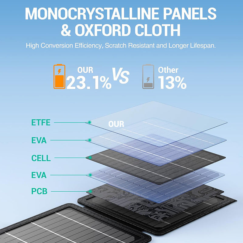 23,1% hohe Effizienz bei der Umwandlung: Die 10W Solarpanels bestehen aus hochwertigen monokristallinen Solarzellen, die Sonnenlicht in Energie umwandeln und eine Umwandlungsrate von 23,1% erreichen. Damit haben Sie jederzeit Zugriff auf unbegrenzte, umweltfreundliche Energie für Ihre Geräte im Sonnenlicht.