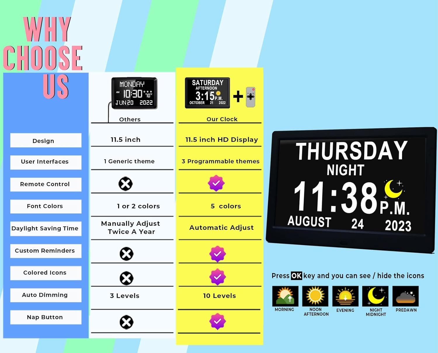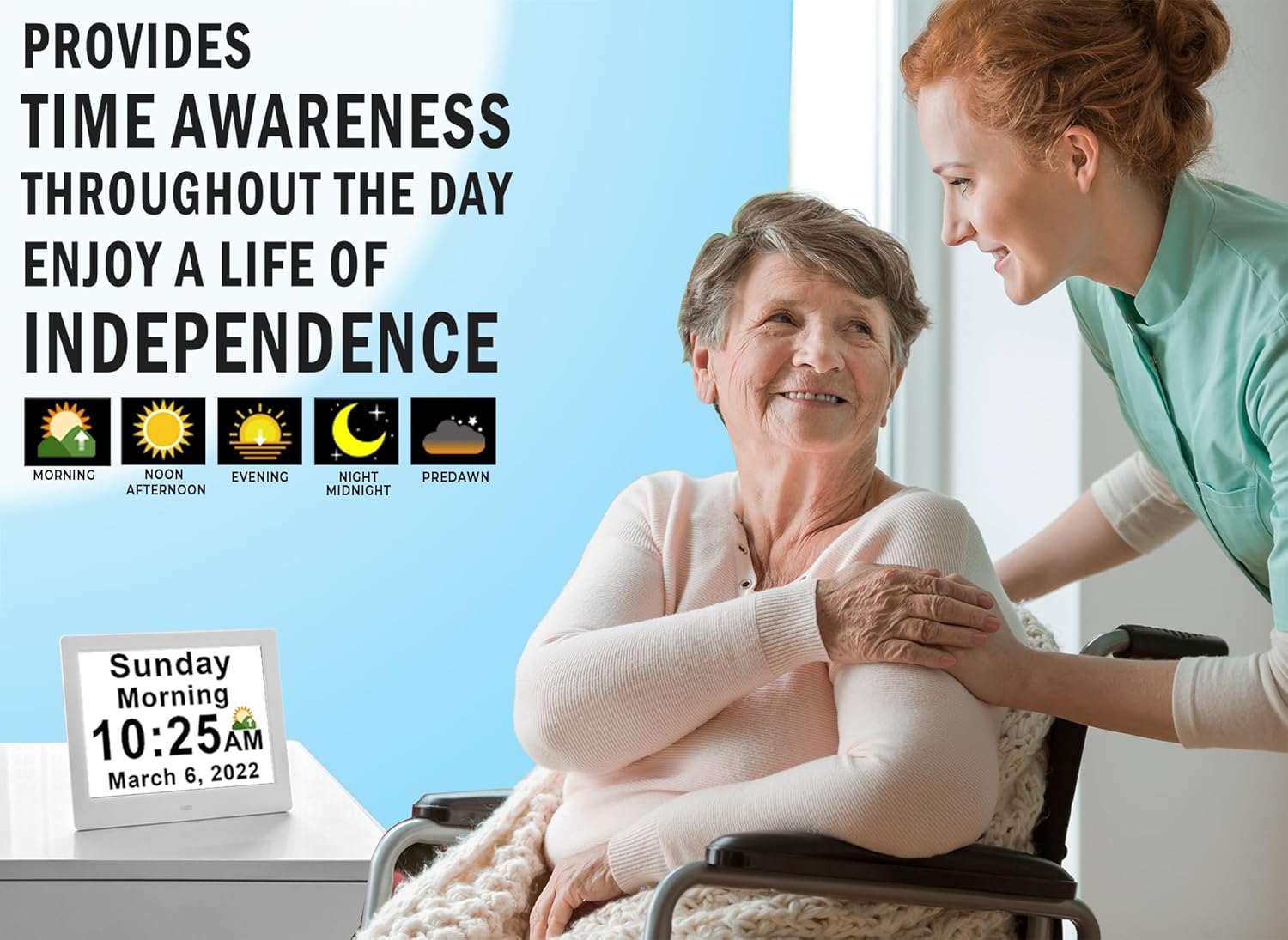 Diese große digitale Tagesuhr verfügt über ein einfach abzulesendes 11,5-Zoll-Display, das ideal für ältere Nutzer, Personen mit Demenz oder Menschen mit Sehbehinderungen ist. Mit 19 einstellbaren Erinnerungen hilft sie, den Alltag zu organisieren, einschließlich Medikation, Mahlzeiten und Termine. Die Uhr zeigt deutlich die Uhrzeit, das Datum und den Wochentag in großen Buchstaben an, was Missverständnisse reduziert und die Selbstständigkeit fördert. Es sind verschiedene Modelle erhältlich, darunter Standard-, 8808- und RGB-Varianten, sodass Sie den Stil auswählen können, der Ihren Bedürfnissen am besten entspricht. Sie ist in Schwarz oder Weiß erhältlich und passt bestens in jedes Zuhause, Kinderzimmer oder Pflegeumfeld.
