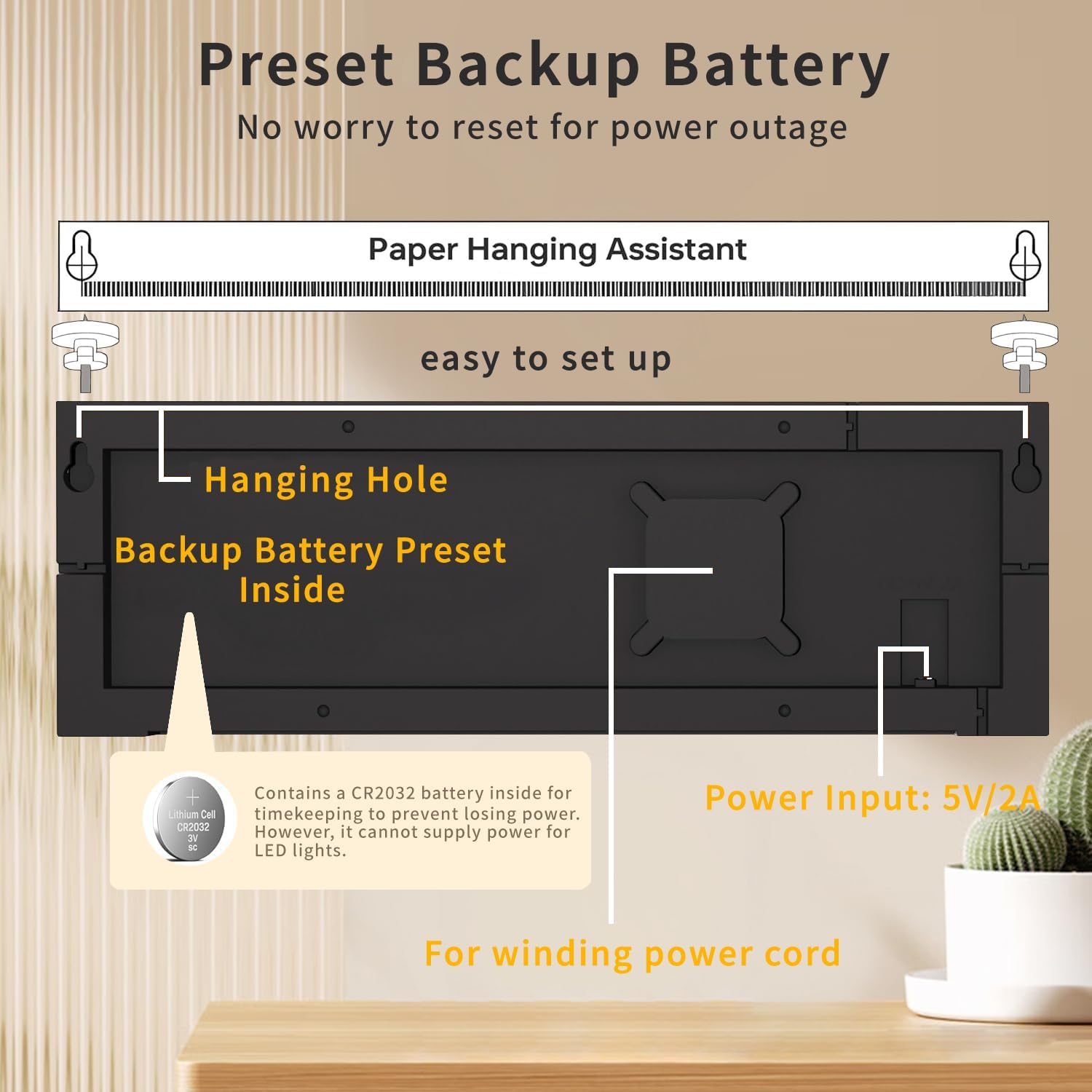 Dieser 16-Zoll digitale Wecker vereint beeindruckende Sichtbarkeit mit zeitgemäßer Funktionalität. Das 8 RGB-Farbdisplay (4 feste Farben + 4 Farbverläufe) erlaubt Ihnen, das Erscheinungsbild anzupassen und bietet gleichzeitig eine exzellente Lesbarkeit aus der entfernten Ecke des Raumes. Mit den doppelt einstellbaren Alarmen und einer extra lauten Lautstärke von bis zu 115 dB eignet er sich hervorragend für sowohl zarte als auch tief schlafende Personen, einschließlich Senioren. Die verstellbare Helligkeit mit automatischer Dimmfunktion sorgt dafür, dass das Display sowohl tagsüber als auch nachts angenehm bleibt, und ein integriertes Nachtlicht bringt eine gemütliche Atmosphäre in Ihren Raum. Zu den weiteren Eigenschaften zählen ein Countdown-Timer, 12/24 h Zeitoptionen, Datums- und Temperaturanzeige sowie eine nützliche Fernbedienung für schnelle Einstellungen. Er kann sowohl auf einem Tisch stehen als auch an einer Wand montiert werden und wird über den enthaltenen 5 V Adapter mit Strom versorgt, um eine stabile Leistung sicherzustellen.