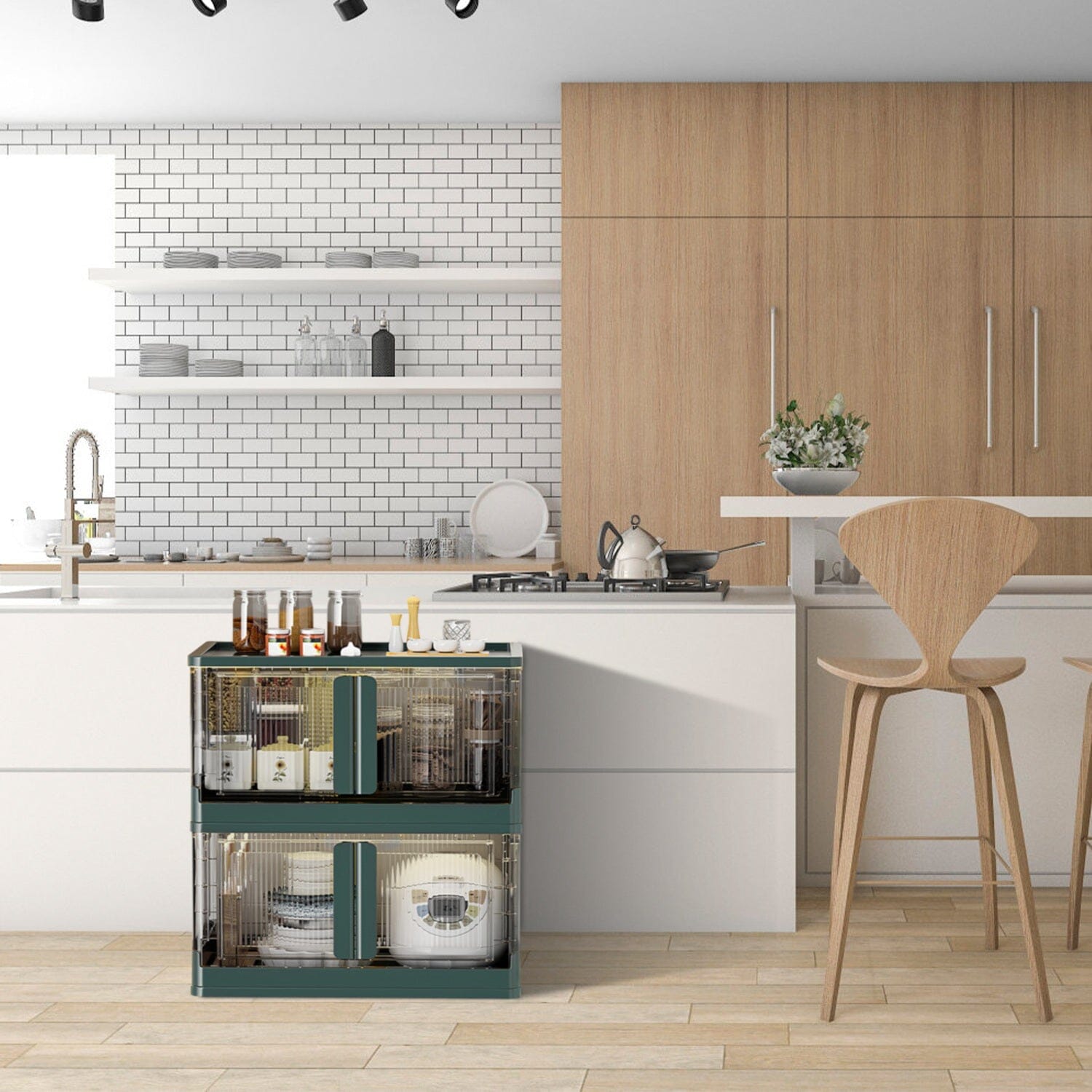 Für die Montage sind keine Werkzeuge erforderlich, und es ist nicht notwendig, die Wand zu bohren. Der freistehende Lagerbehälter mit Deckel und Türen ist eine wertvolle Ergänzung für Ihr Zuhause. Er kann stabil übereinander gestapelt werden, was Platzersparnis mit sich bringt. Um auf Ihre Sachen zuzugreifen, heben Sie einfach den Deckel und die beiden vorderen Türen an. Der Sicherheitsmechanismus an der Tür gewährleistet, dass Ihre Gegenstände während des Transports sicher im Container verbleiben. Diese Aufbewahrungslösungen sind vielseitig einsetzbar in Räumen wie Badezimmer, Wohnzimmer, Kinderzimmer und Küche. Sie eignen sich hervorragend zur Aufbewahrung von Snacks, Wein, Getränken, Gewürzen, Besteck, Toilettenartikeln, Handtüchern, Hautpflegeprodukten und Spielzeug. Mit den seitlichen Griffen und den 4 Rollen an der Unterseite können Sie die Behälter mühelos bewegen, egal ob beim Bodenwischen oder beim Transport in einen anderen Raum. Die Aufbewahrungsbehälter mit Deckeln werden flach geliefert; es genügt, 4 Paneele aufzustellen und zusammenzufügen, um den Deckel zu schließen. So können Sie sofort mit dieser faltbaren Aufbewahrungsbox mit Türen beginnen.