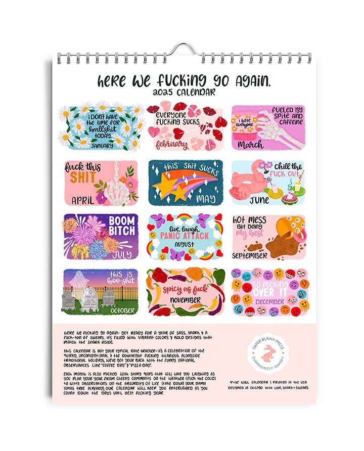 - Wir sind hier wieder mit einer frechen Attitüde am Start, mach dich bereit für ein Jahr voller Ungezogenheiten, Sarkasmus und einer Menge Flüche. Dieser Kalender sprüht vor lebhaften Farben und gewagten Designs, die dem frechen Geist entsprechen.