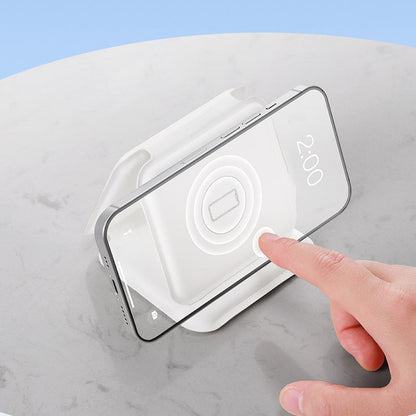 Das Ladegerät ist mit Magneten auf beiden Seiten ausgestattet, die zusammengeklappt und stabil fixiert werden können, um schnell einen Smartphone-Ständer zu schaffen. Damit haben Sie Ihre Hände frei und können während des Streamings bequem laden.