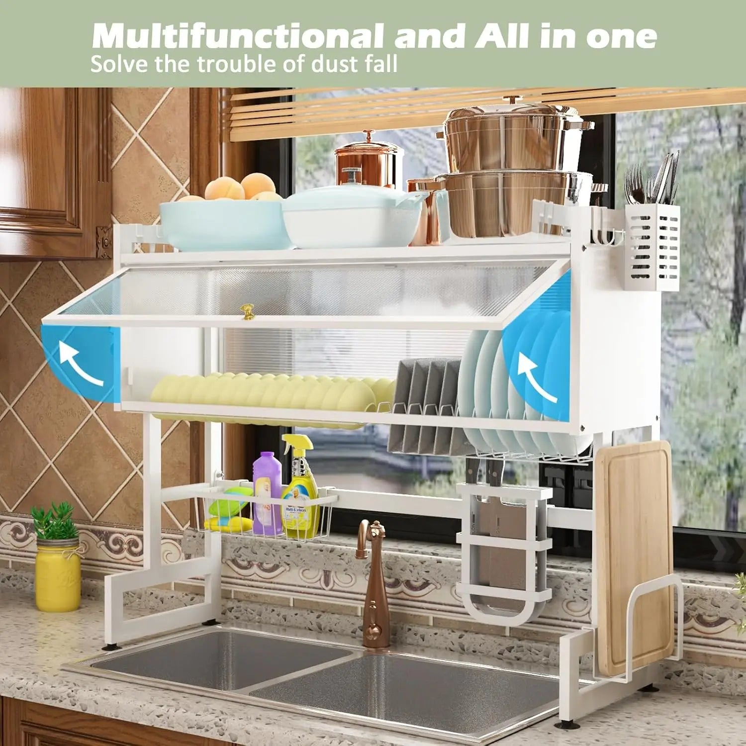 - Innovatives Design mit durchsichtiger Tür: Die erste Ebene dieses Geschirrständers umschließt vollständig die zweite Ebene und verhindert, dass Staub an Geschirr und Küchenutensilien haftet. Eine durchsichtige Tür mit konkaven und konvexen Streifen wirkt ebenfalls als zusätzliche Barriere gegen Staubansammlungen.