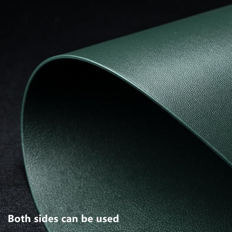 Schlicht und doch besonders: runde und dreieckige Tischunterlage mit einem Kunstlederuntersetzer.
