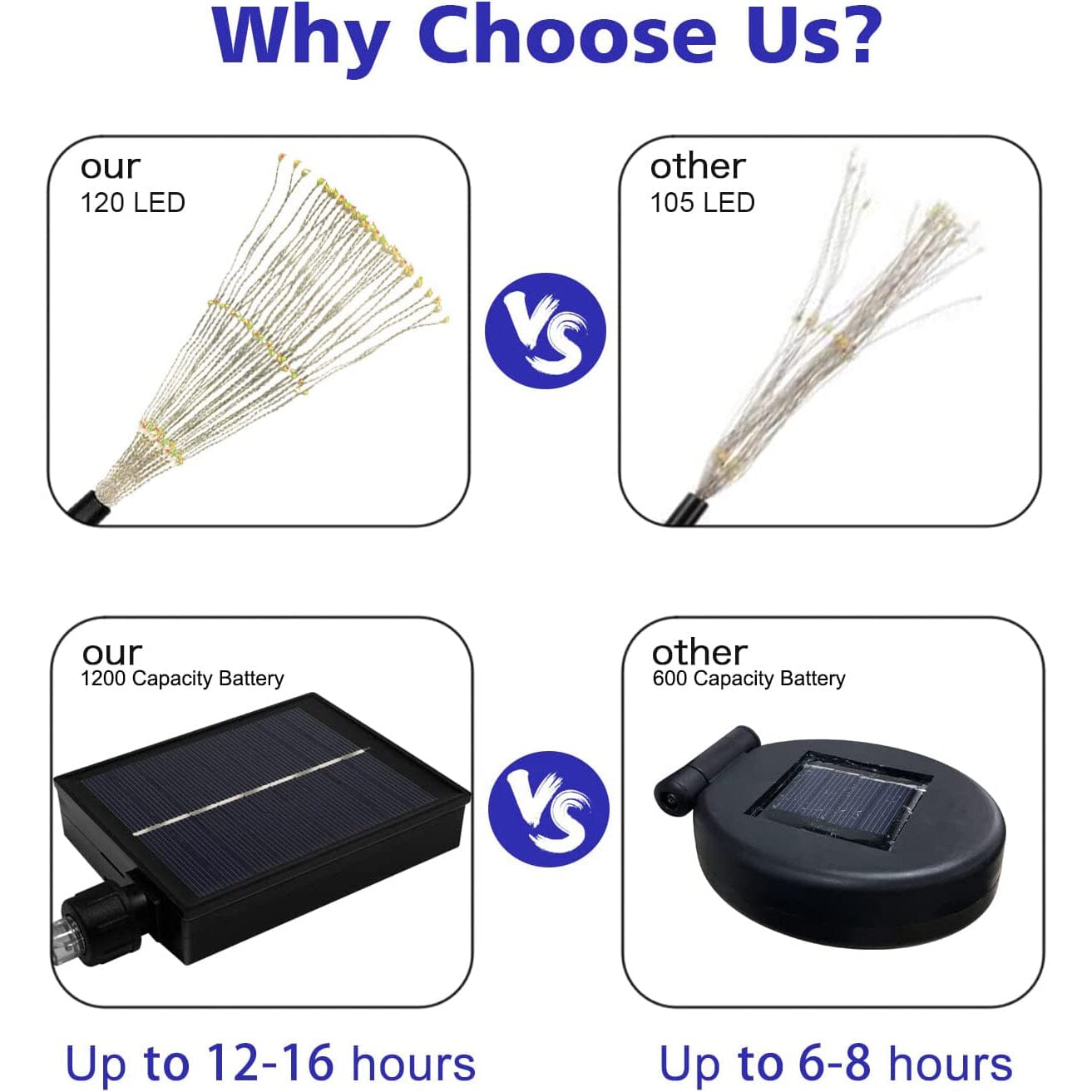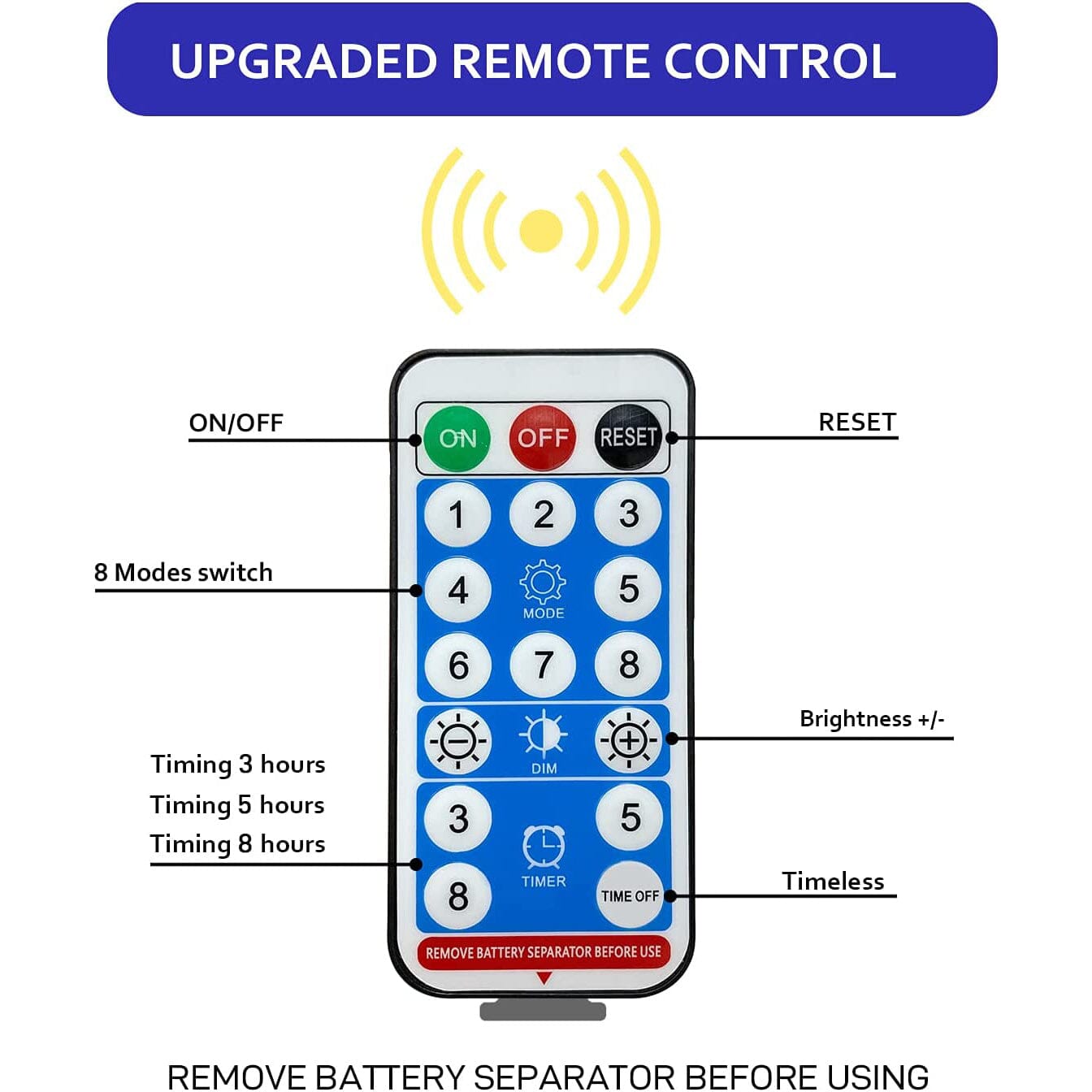 - Diese Solarlichter zur Verschönerung Ihres Gartens werden mit einer Fernbedienung geliefert, die 8 verschiedene Blitzmodi und 3 Helligkeitsstufen zur Auswahl hat. Unterschiedliche Beleuchtungseffekte sorgen für eine bezaubernde Atmosphäre. Außerdem schalten sich die Solarlichter nachts automatisch ein und tagsüber aus, dank einer integrierten Lichtsensorfunktion. Die Leuchtdauer kann mit der Fernbedienung auf 3/5/8 Stunden eingestellt werden.