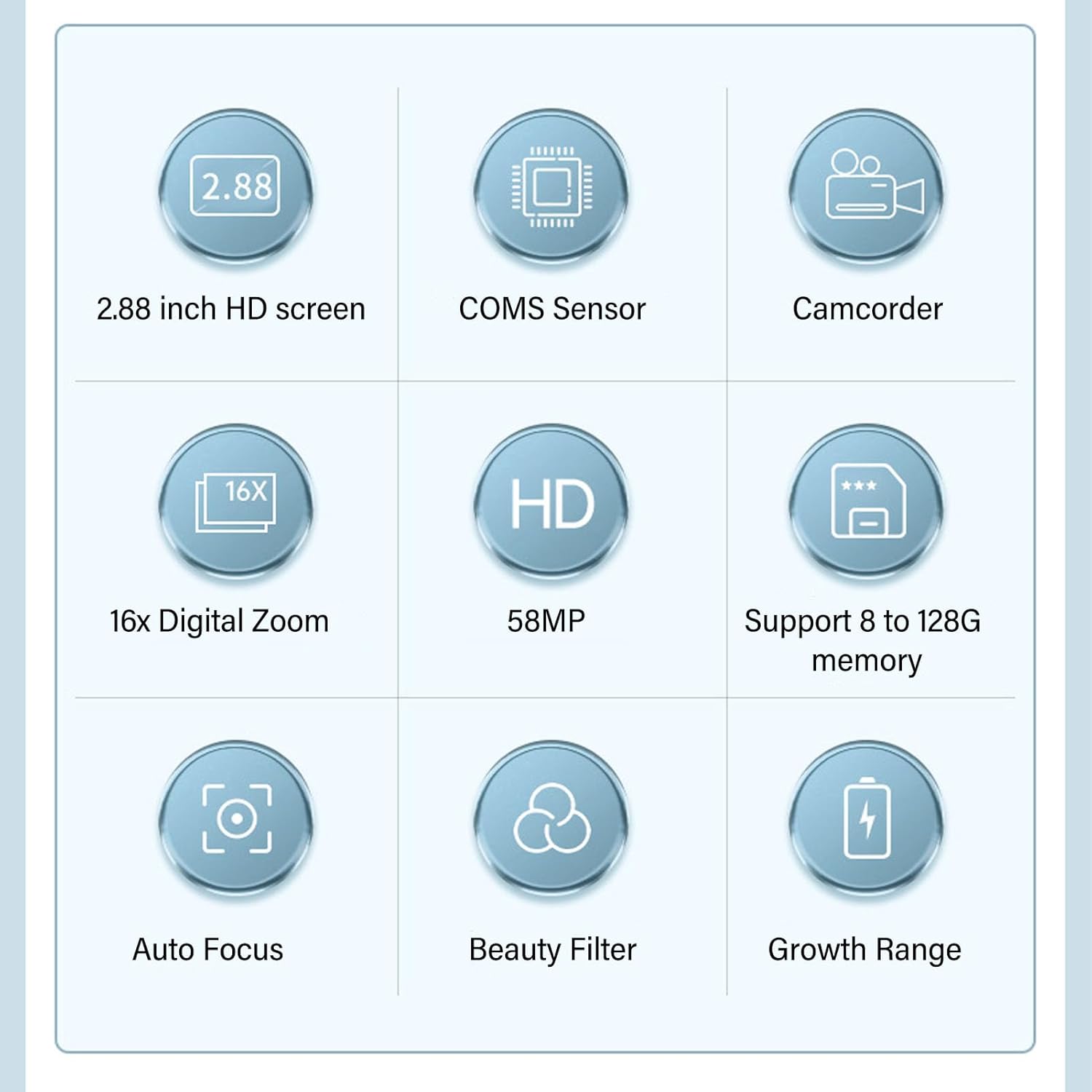 Diese kompakte 4K Digitalkamera bietet 58MP hochauflösende Bilder und gestochen scharfe Videos, ideal für Jugendliche, Studenten und Fotografieneulinge. Mit einem 16× digitalen Zoom und einem 2,88-Zoll-Display ermöglicht sie es, besondere Momente einfach festzuhalten, egal ob nah oder fern. Leicht und tragbar, passt sie mühelos in eine Tasche oder einen Rucksack – perfekt für Reisen, Schule oder den täglichen Gebrauch. Dank der benutzerfreundlichen Steuerung ist sie eine verlässliche Point-and-Shoot-Kamera für Kinder und junge Fotografen, die Wert auf Qualität ohne Komplikationen legen.