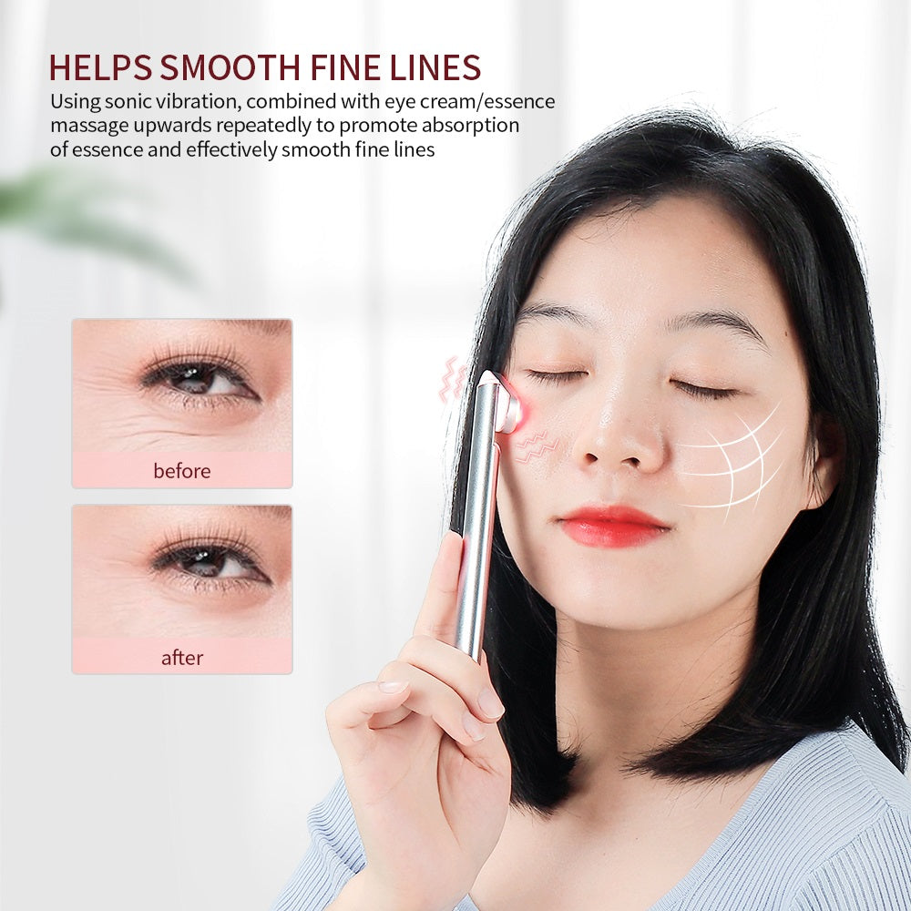 Hochfrequente Vibration - Die Schallvibration in Verbindung mit Augencreme oder -essenz unterstützt die Aufnahme der Wirkstoffe und glättet effektiv feine Linien. Verabschieden Sie sich von Tränensäcken und feinen Fältchen!