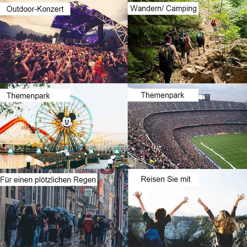 • Einweg-Notfall-Regenponchos, die zusammen mit dem tragbaren Ball für Schutz und Trockenheit bei ungünstigen Wetterbedingungen sorgen.