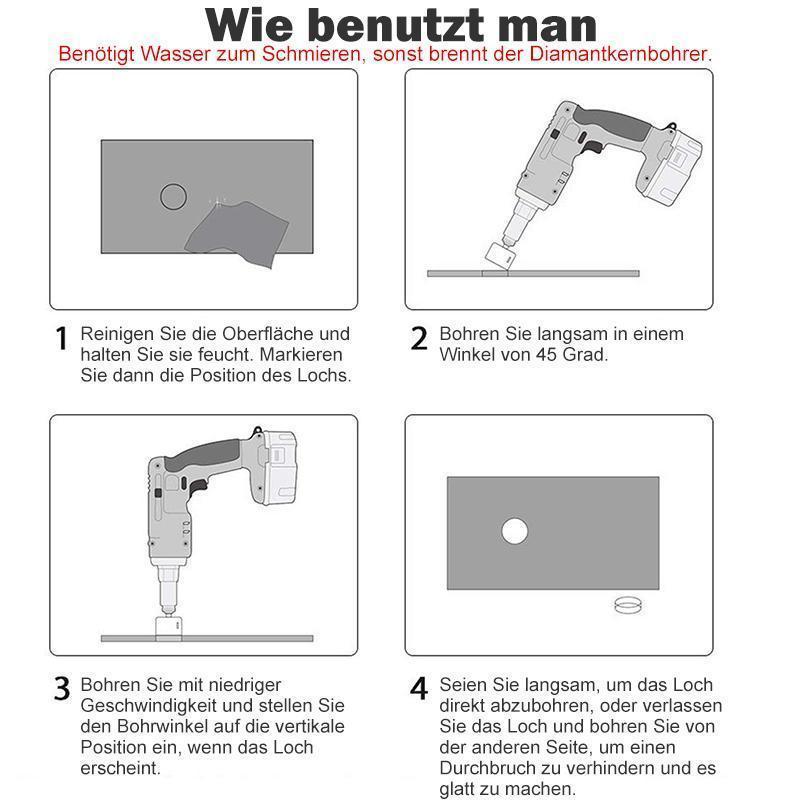 Nicht geeignet für Beton oder Tiefen über 30 mm (1/2 "). Beim Bohren muss Wasser zur Kühlung eingesetzt werden.
