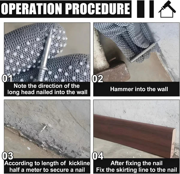 Vergessen Sie die herkömmlichen Methoden zur Anbringung von Sockelleisten, die unschöne Löcher hinterlassen. Unsere beidseitigen, nicht markierenden Nägel benötigen kein Bohren und bringen die Sockelleisten in nur zwei einfachen Schritten an.
