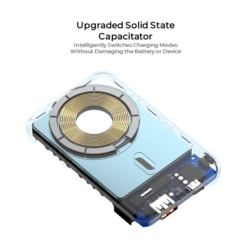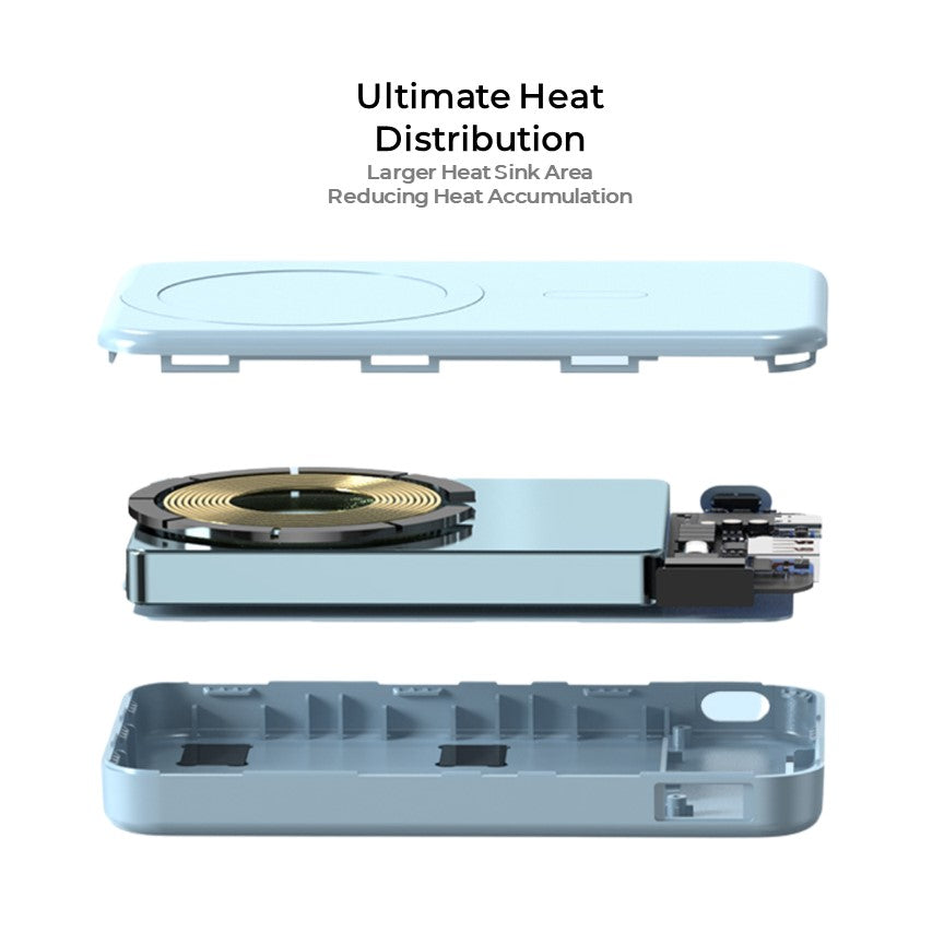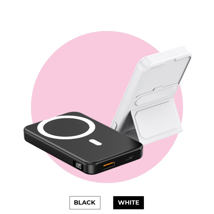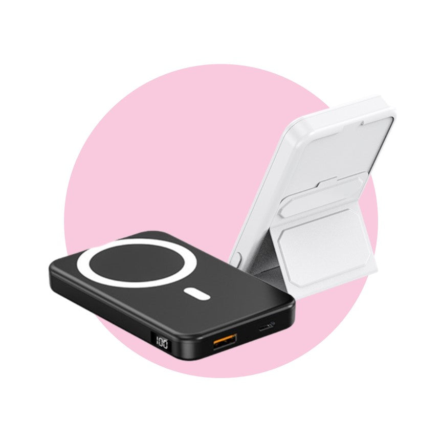 Halten Sie Ihre Geräte auf Reisen mit dieser 10000mAh Power Bank, die MagSafe-kompatibel ist, immer geladen. Sie lädt Ihre Qi-kompatiblen Geräte schnell und kabellos – bis zu dreimal. Mit einem integrierten Ständer und einem LED-Display ausgestattet, ermöglicht diese Power Bank das gleichzeitige Laden mehrerer Geräte über MagSafe, USB-C und USB-A und bietet eine Leistung von bis zu 22,5W. 🔋