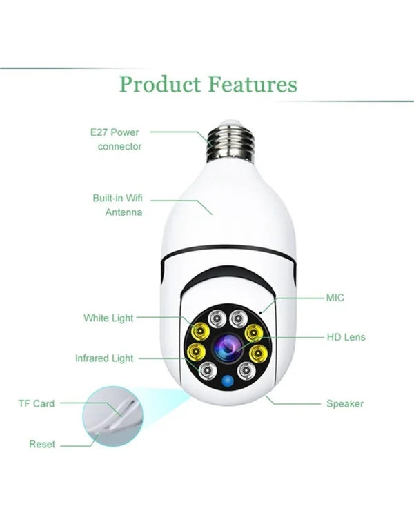 Diese Kamera lässt sich problemlos in eine Standard E27-Lampe (110V~240V) einsetzen – KEINE ZUSÄTZLICHEN INSTALLATIONSSCHRITTE notwendig. Danach müssen Sie nur das Kamerasystem mit Ihrem Router verbinden und die App öffnen, um die Kamera in wenigen Minuten einzurichten.