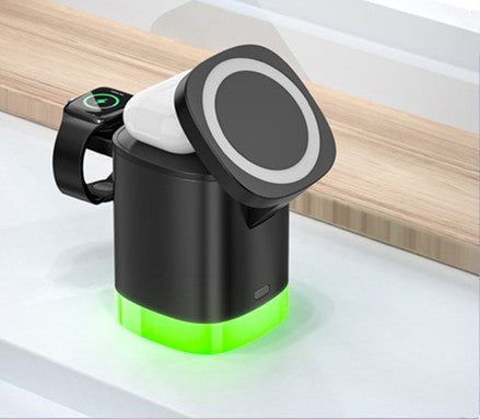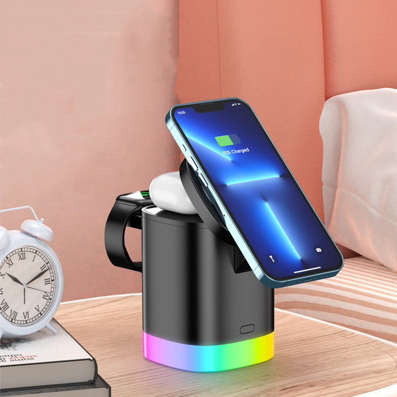 Egal ob zu Hause oder auf Reisen, nur ein Ladegerät benötigt man.Verbesserte Ladeeffizienz.Kompatibel mit Kopfhörern und Uhren.Faltbares und handliches Design.RGB mit beeindruckenden Lichteffekten.Abmessungen.