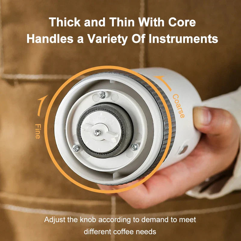 4. Stufenlose Dickeneinstellung. Das Kaffeepulver wird gleichmäßig und fein, die Stärke lässt sich individuell anpassen. Das feinste Kaffeepulver hat eine Maschenweite von 30 Mesh (ca. 90 %).