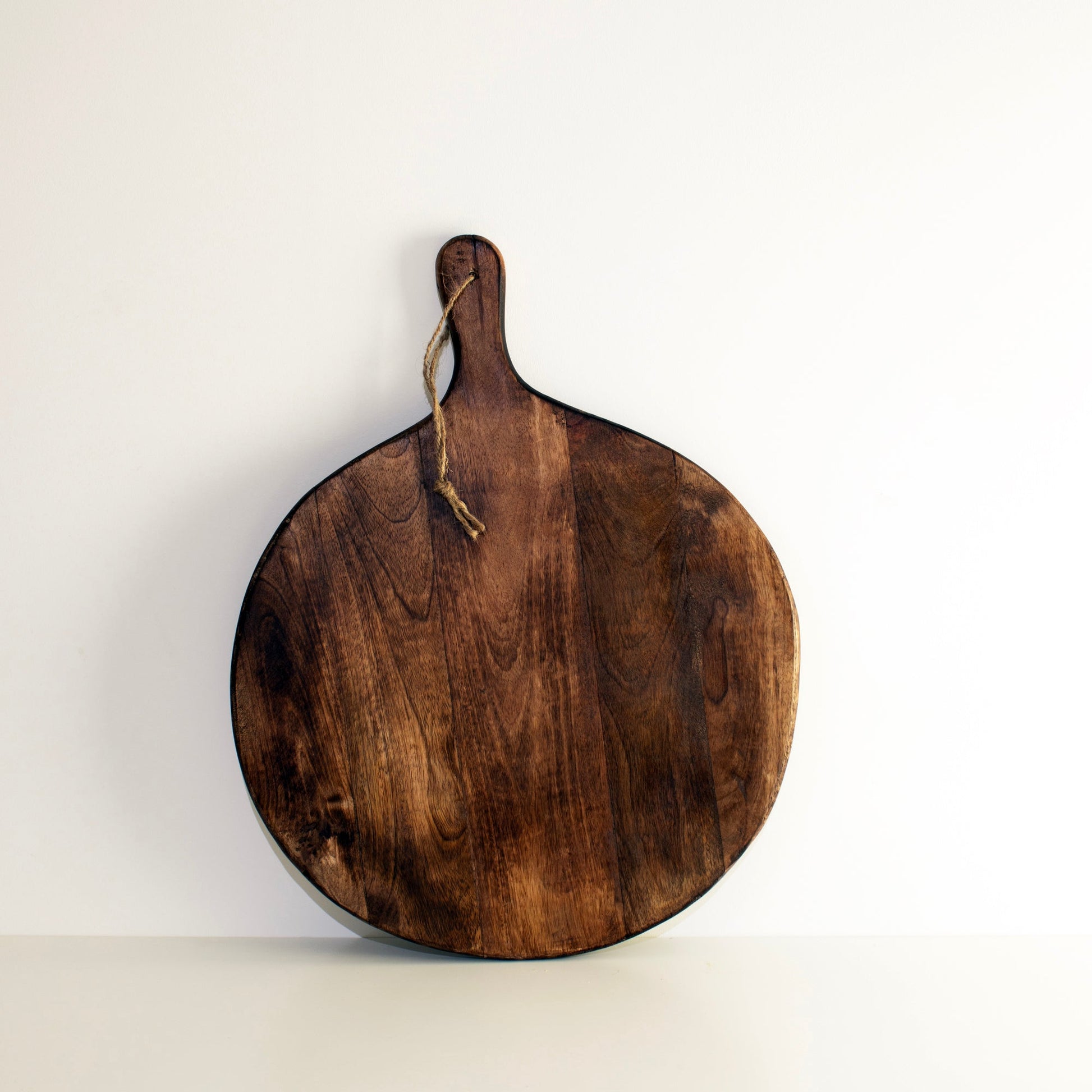 Verleihen Sie Ihrer Küche einen rustikalen Charakter mit diesem unregelmäßig geformten, runden Schneidebrett aus dunklem Holz. Dieses Schneid- und Servierbrett, das aus 100 % Mangoholz hergestellt ist, besticht durch seine einzigartige, unregelmäßige runde Gestalt sowie den tiefen, dunklen Braunton, der sowohl praktisch als auch dekorativ ist. Der stabile Griff mit einer Seilschlaufe bietet nicht nur Komfort, sondern auch eine ansprechende Ästhetik und eignet sich hervorragend zum Aufhängen, wenn es nicht in Gebrauch ist. Perfekt für die Lebensmittelzubereitung oder als Servierplatte für Käse und Snacks, ist es eine nützliche und zeitlose Bereicherung für jede Küche.