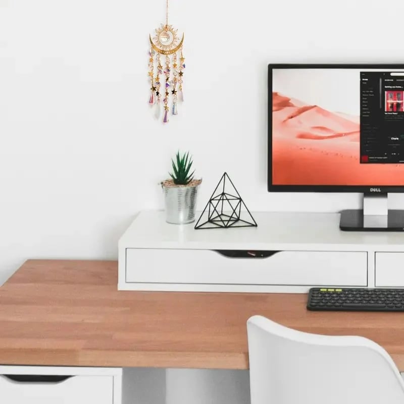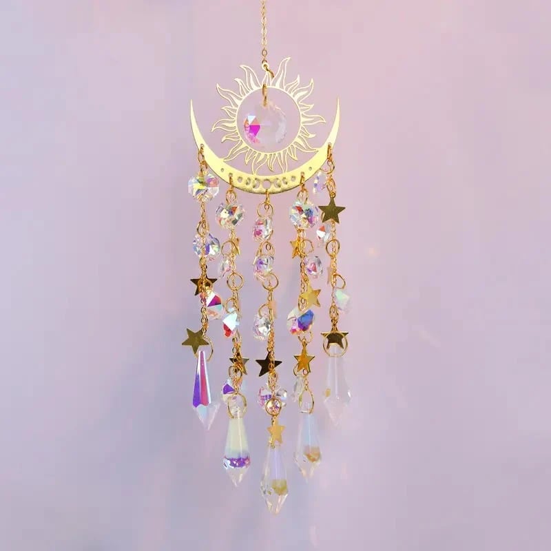 RainbowMaker: Der Sonnenfänger weist einen glänzenden Metallrahmen auf, der mit Mustern von Sonne, Mond und Sternen verziert ist. Künstliche Kristalle und Anhänger fangen das Licht ein und erzeugen einen zauberhaften Licht- und Schatteneffekt. Das besondere Design, die exquisite Handwerkskunst sowie die ausgeprägte Dekorativität machen es zu einem fesselnden Kunstwerk.
