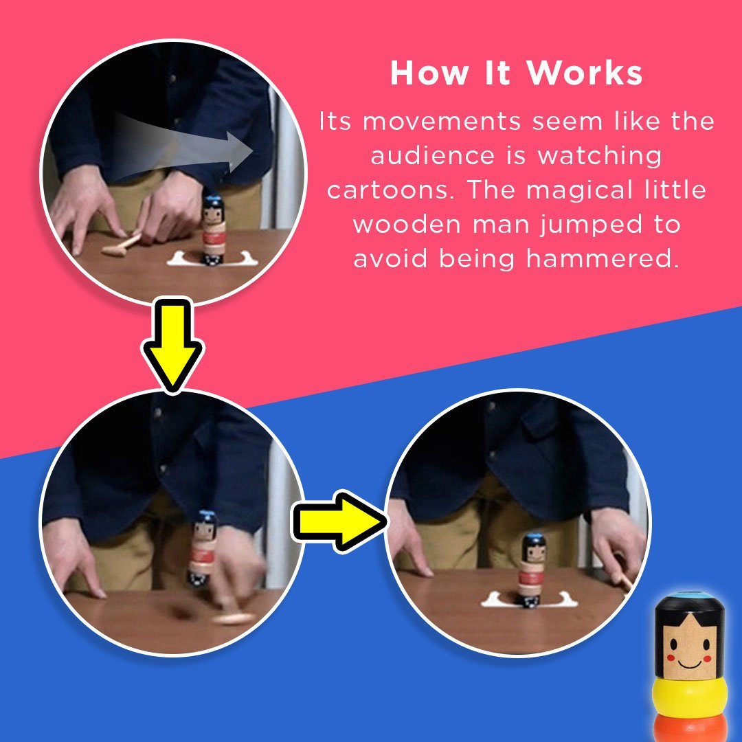 So funktioniert es: Mit dem Hammer darauf klopfen, dann zieht der unsichtbare Faden – und der Holzmann steht auf! Für die optimale Illusion: Halte einen Abstand von 1,5 m ein & trage dunkle Kleidung.