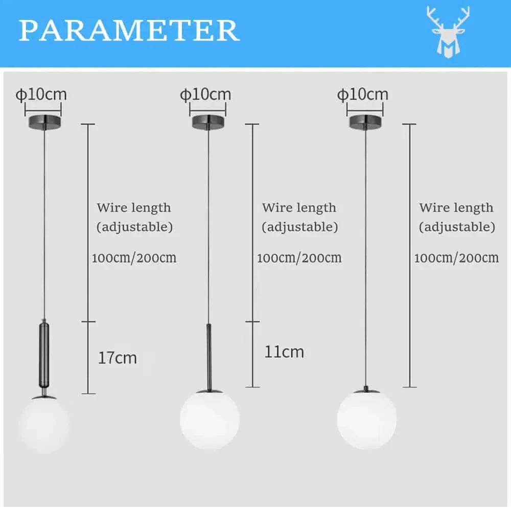 Die Mid-Century Modern Glass Ball Pendelleuchten verfügen über eine Kabelpendelinstallation von 100 cm, die eine unkomplizierte Montage und Anpassung an die gewünschte Höhe ermöglicht. Sie sind mit LED-Glühbirnen kompatibel (Glühbirnen im Lieferumfang nicht enthalten) und bieten somit eine energieeffiziente und langlebige Lichtquelle.