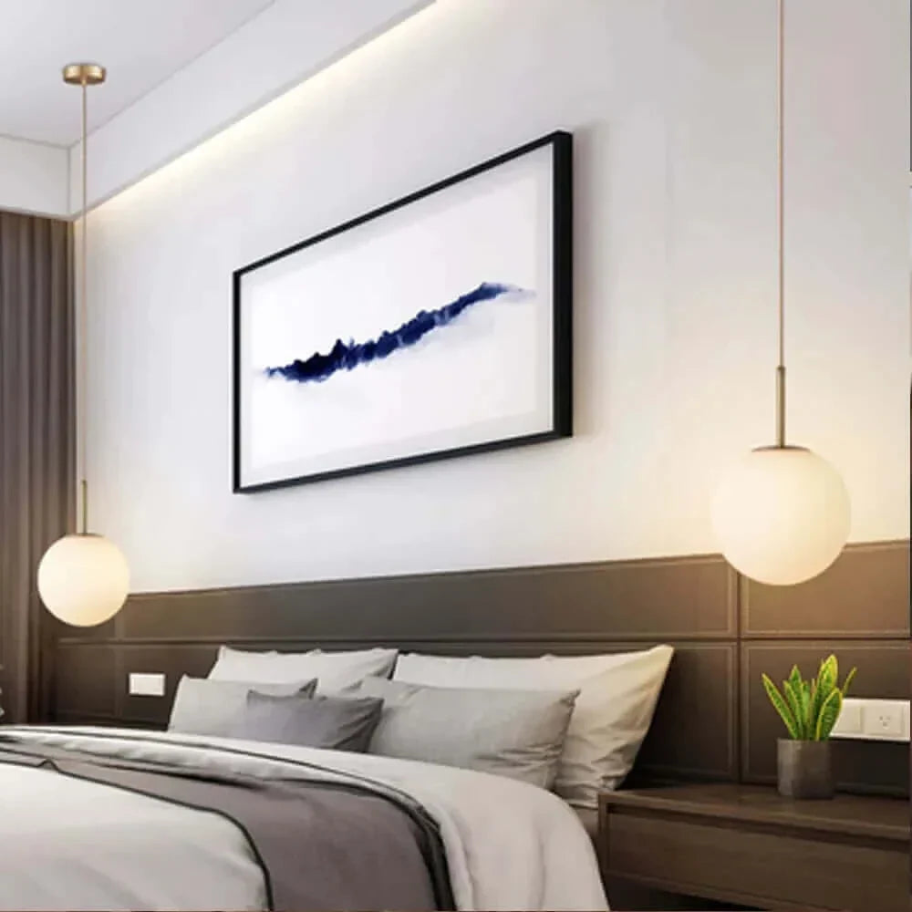 Dieses Lichtobjekt wurde entworfen, um ein vielseitiges Element in jedem Innendesign zu sein. Egal, ob es sich um die warme, einladende Atmosphäre eines Hauptschlafzimmers oder um den funktionalen, lebhaften Raum eines Wohnzimmers handelt, die Anpassungsfähigkeit der Pendelleuchte ermöglicht es, sich harmonisch in die bestehende Einrichtung einfügen oder als hervorstechendes Element wirken zu lassen, ganz nach Ihren persönlichen Vorlieben. Der frosted Glasball zusammen mit einem klassischen weißen Lampenschirm verströmt eine elegante und stilvolle Beleuchtung und schafft eine gemütliche und ruhige Atmosphäre im beleuchteten Raum.