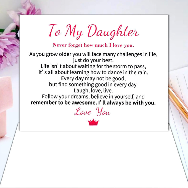 Dieses Armband, das mit einer bedeutungsvollen Nachricht auf der Geschenkkarte und einem attraktiven Design versehen ist, stellt das ideale Geschenk dar. Schenken Sie Ihrer Tochter oder Enkelin dieses Armband und motivieren Sie sie mit der Botschaft auf der Karte. Es kann eine Quelle der Kraft und Inspiration für sie sein, besonders in schwierigen Zeiten.
