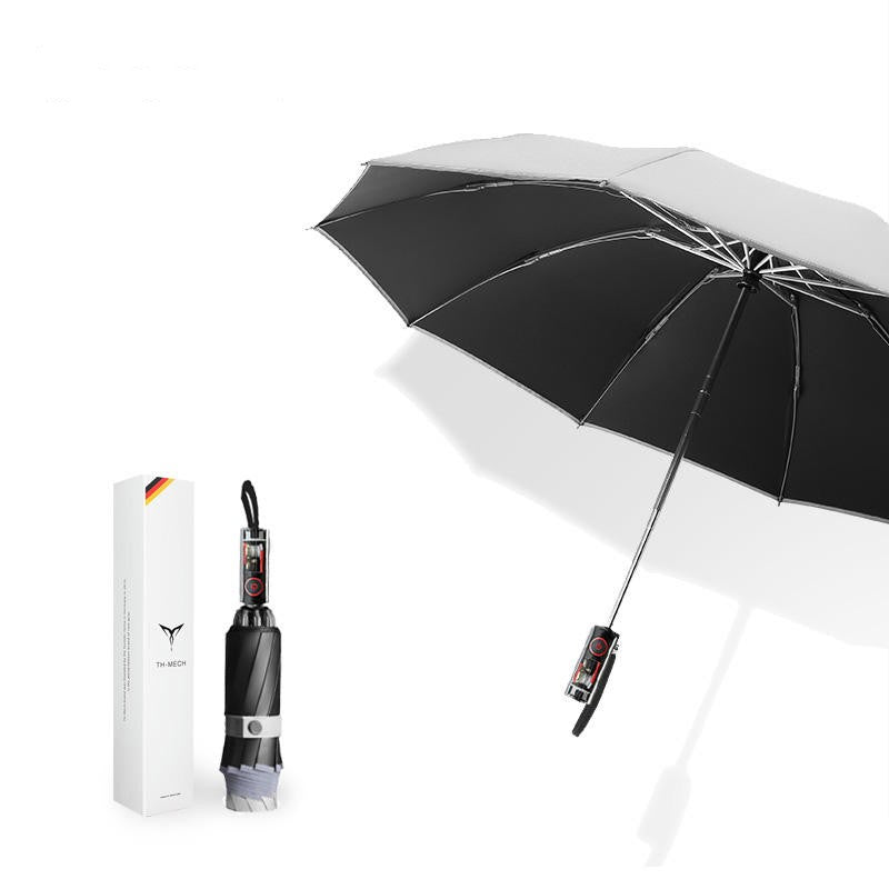 Dieser automatisch betriebene Rückwärtsregenschirm nutzt die modernsten Technologien, um das Abperlen von Wasser zu verhindern.Gefertigt aus robusten Materialien, die sicherstellen, dass der Schirm rostfrei bleibt und auch bei Verformungen seine Stabilität behält.