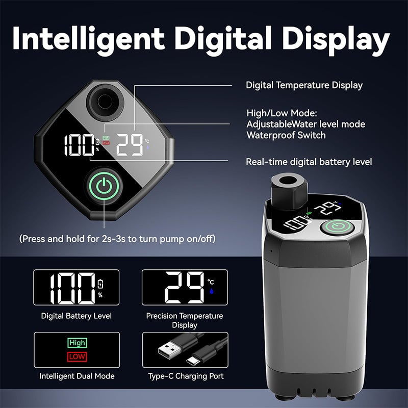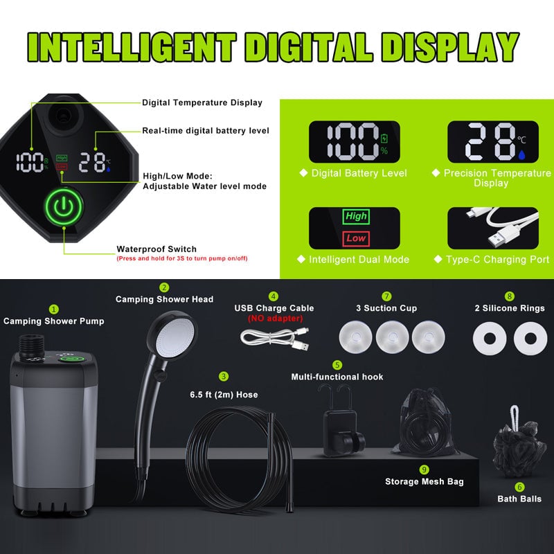 【Verbesserte LED-Anzeige】 Diese tragbare Campingdusche verfügt über eine verbesserte LED-Anzeige, die auf einfache Weise den Ladezustand und die Wassertemperatur anzeigt. Mit einem Temperaturbereich von 32–140°F (ca. 32–60°C) vermeiden Sie Verbrennungen sowie Unterbrechungen beim Duschen und können Ihr Outdoor-Erlebnis unbesorgt genießen.
