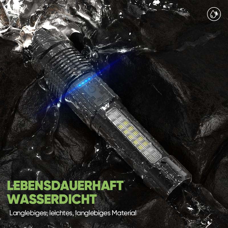 Wasserdicht für alle Bedingungen: Bewältigen Sie widrige Wetterverhältnisse mit Zuversicht, denn diese Taschenlampe ist darauf ausgelegt, starken Regen und rauen Wetterbedingungen zu trotzen, sodass Sie sie auch bei heftigem Regen ohne Bedenken verwenden können.