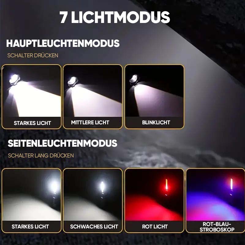 Mehrere Beleuchtungsmodi: Seien Sie in jeder Lage flexibel mit veränderbaren Lichteinstellungen, die perfekt auf Ihre Bedürfnisse zugeschnitten sind. Wechseln Sie mühelos zwischen 7 verschiedenen Modi und passen Sie Helligkeit sowie Strahlmuster mit einem einzigen Klick an.