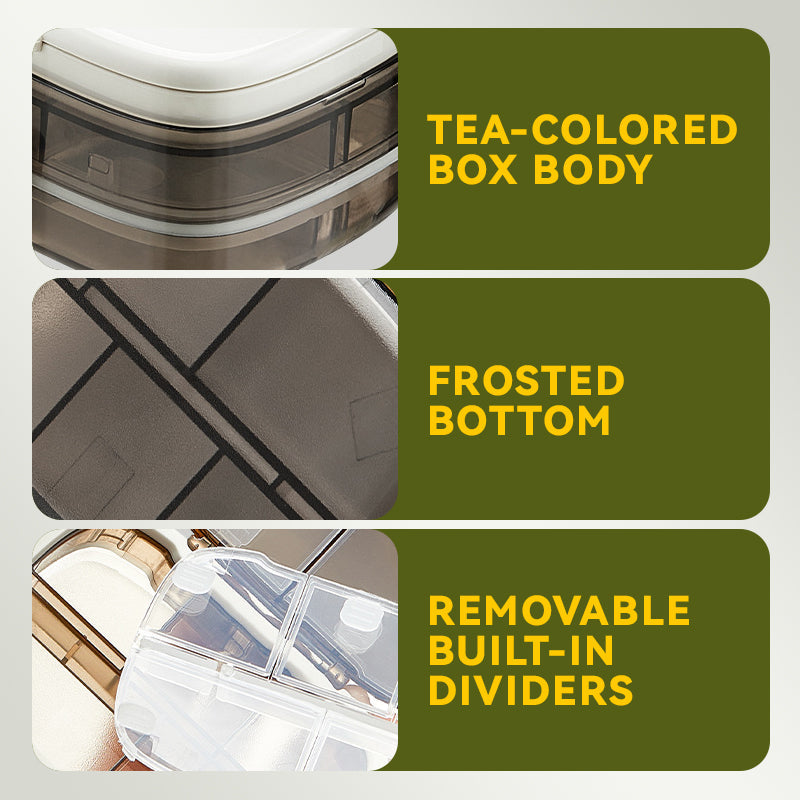 INTELLIGENTES DESIGN MIT ZEHN FÄCHERN- Zehn unabhängig versiegelte Fächer isolieren verschiedene Nahrungsergänzungsmittel vollständig. Jedes Fach fasst 2-3 Standardkapseln oder -tabletten und erleichtert so die tägliche Dosierungsverwaltung, während es eine Kreuzkontamination von Gerüchen und Aromen zwischen den Fächern verhindert.
