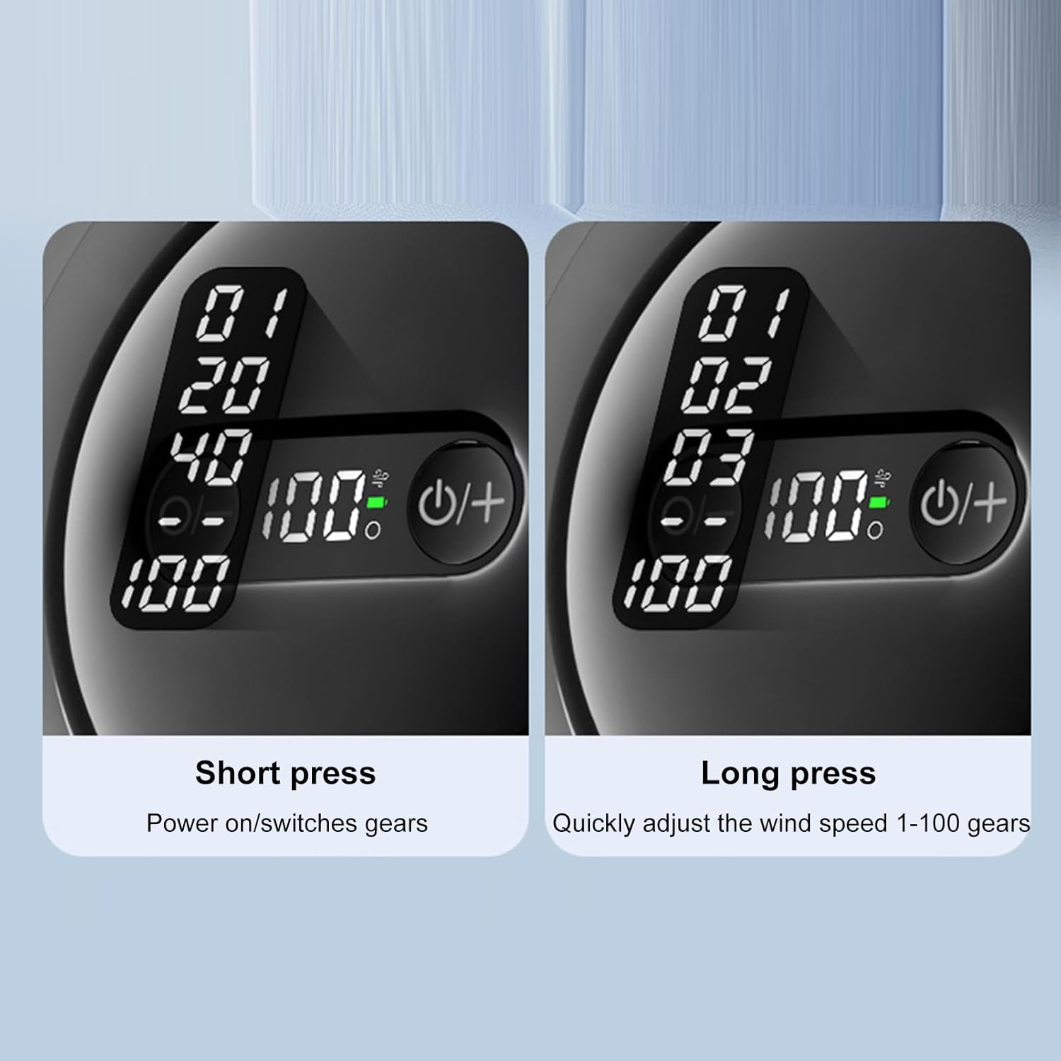 - 100-stufenlos einstellbare Windgeschwindigkeit mit LED-Display