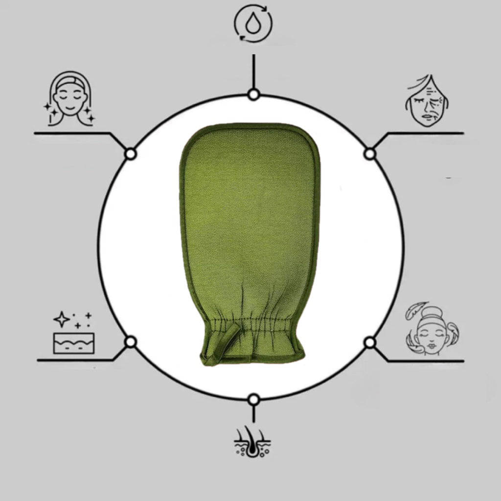 Handgefertigt aus biologischen Pflanzenfasern, entfernt der exfolierende Handschuh sichtbar abgestorbene Haut nur mit Wasser. Beende trockene und schuppige Haut, Keratosis pilaris, eingewachsene Haare und unebene Hautstruktur...